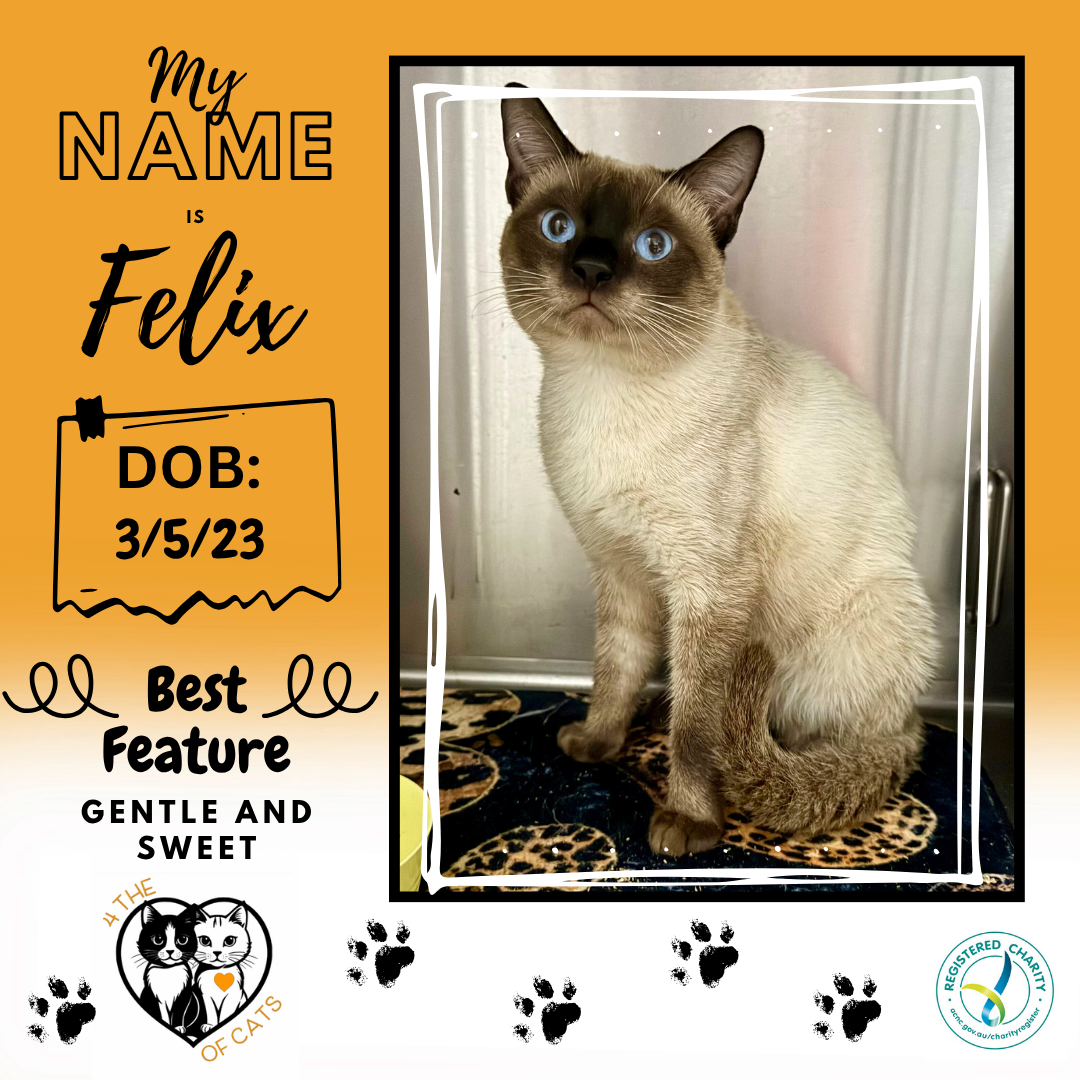 Felix is a striking little guy who is cool, calm and collected. He has an easy going attitude and is gentle and sweet.
