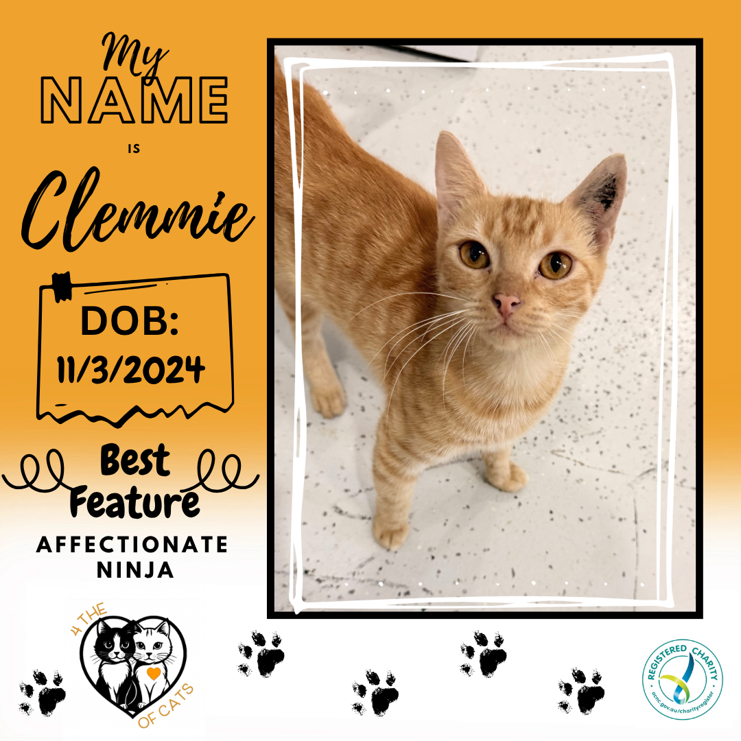 Don’t let the delicate ginger fur fool you Clemmie is a force of nature in a fur coat. Part ninja, part love bomb, this fiery feline has one mission in life: you.