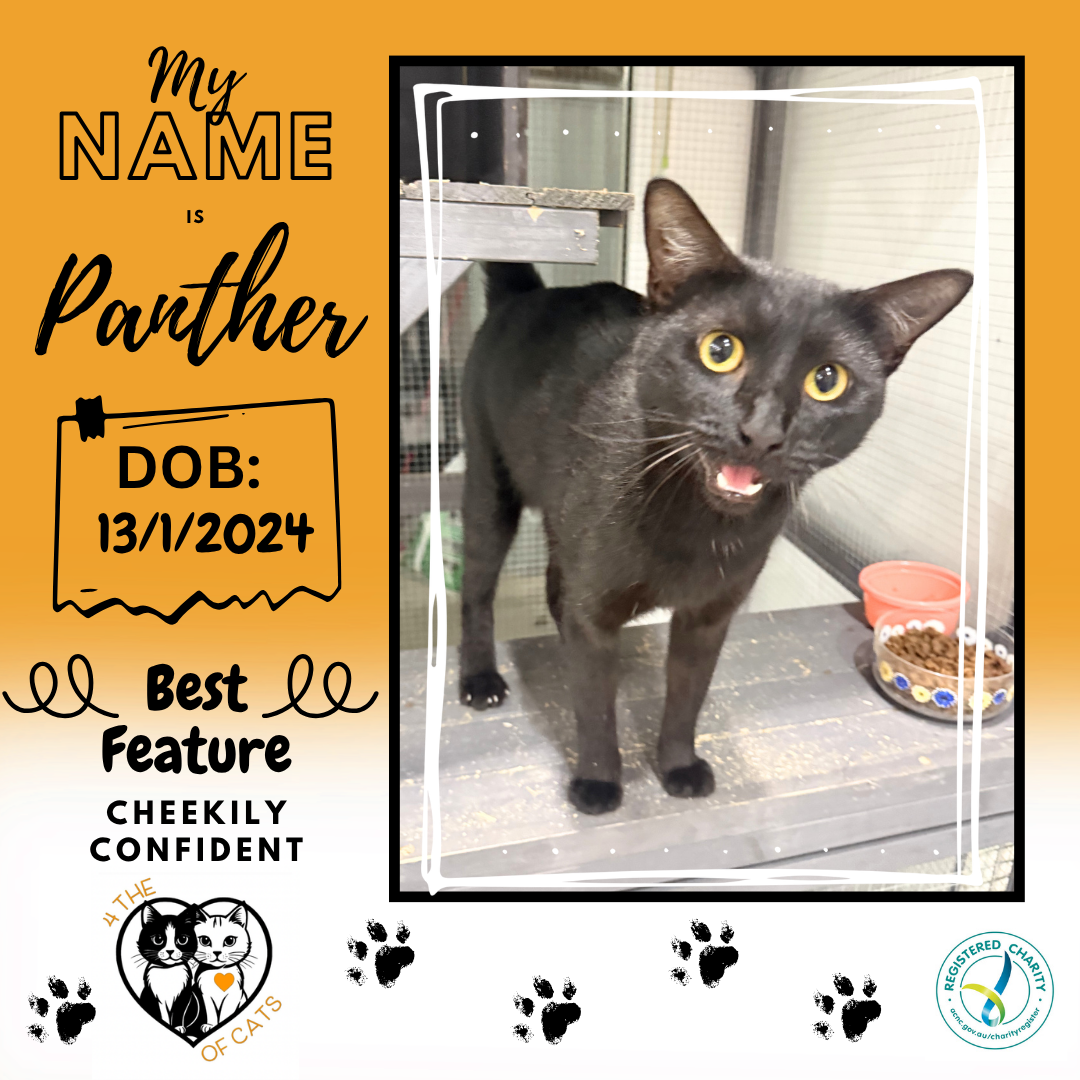 This sleek, stunning black cat has a personality as big as his good looks, and he’s made an art form out of getting exactly what he wants. Cheeky, charismatic, and completely irresistible, Panther has a way of wrapping people around his little paw without even trying.