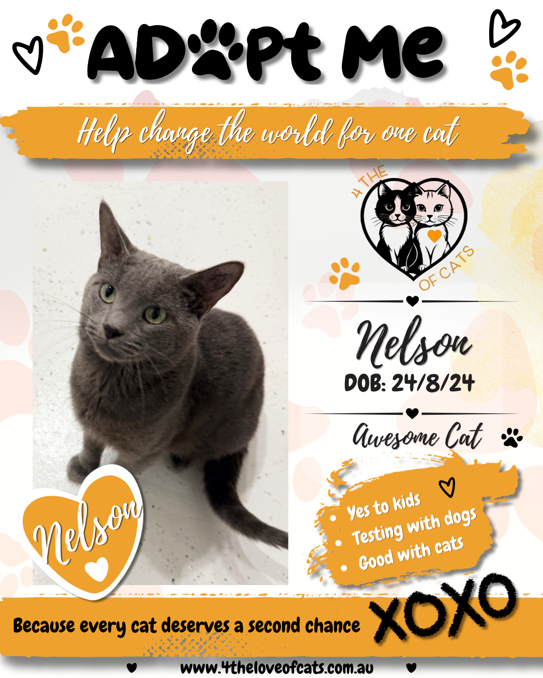 Nelson is one of those cats who just makes every day a little warmer. He is gentle, loving, and endlessly fun and if you dare walk past him without stopping for a pat, he will reach out and gently grab you, because being near you is simply where he wants to be. He adores a good head massage and has the most wonderful way of reminding you that you are loved. Despite being an adult, Nelson has a youthful spark that lights up any room, he still loves to play and keeps the fun alive every single day.